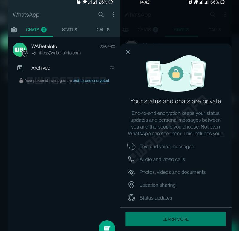 Esta página informa ao usuário o que está protegido usando criptografia de ponta a ponta, como todas suas notas de texto e voz (incluindo arquivos de áudio), chamadas de áudio e vídeo, fotos, vídeos e documentos, compartilhamento de local e atualizações de status. Confira: