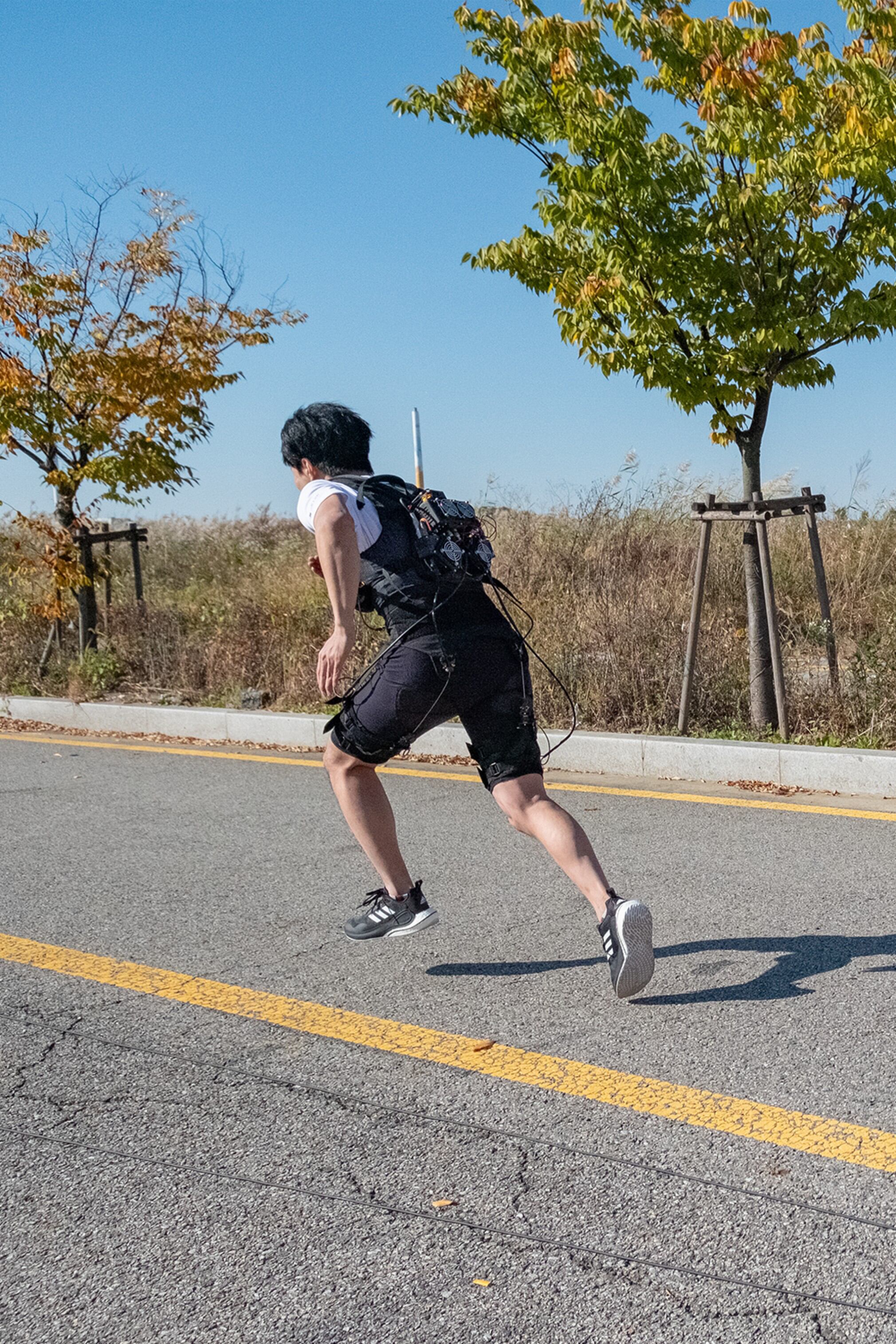 Estamos colaborando com um ex-velocista nacional da Coreia para quebrar recordes mundiais. Embora não esperemos que se tornem recordes oficiais, pretendemos utilizar o traje-robô como uma ferramenta de treinamento para corredores. Experimentar velocidades extremas com o traje-robô pode ajudar os atletas a internalizar as sensações e o comprometimento muscular necessários nessas velocidades.