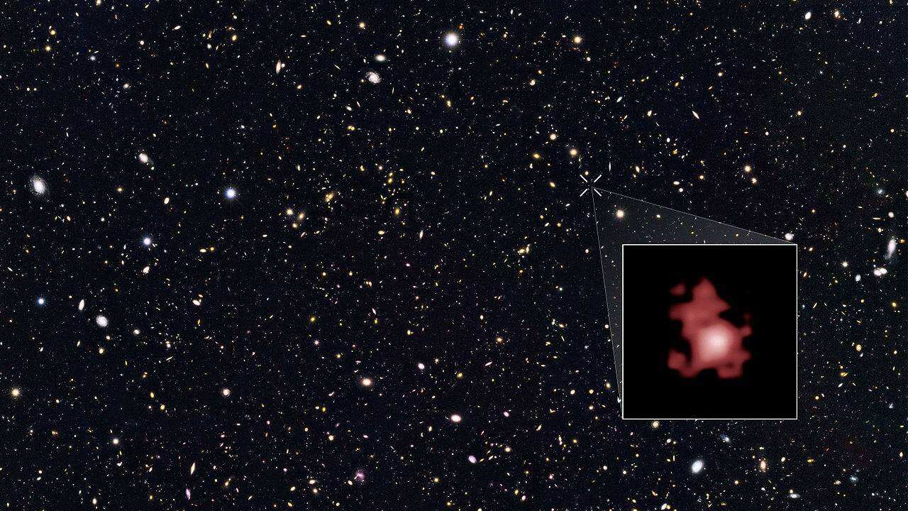 Trata-se da galáxia GN-z11, a mais distante detectada em toda a história da humanidade. Encontrá-la com a lente do telescópio espacial foi um recorde quando a descobriram em 2016, pois está a apenas 400 milhões de anos do Big Bang.