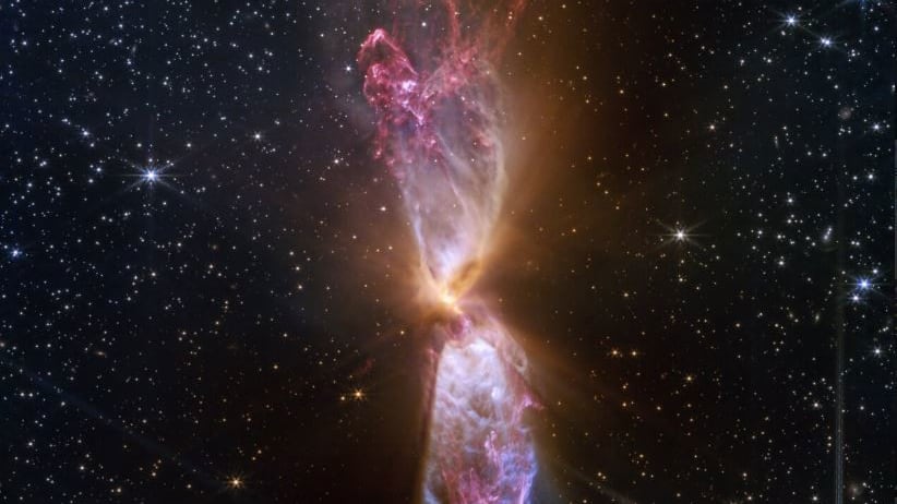 O que o Telescópio Espacial James Webb captura é o que você vê em nossa imagem de capa. São duas estrelas jovens em plena formação e por conta dessa condição são responsáveis pelos chocantes jatos de gás e poeira em tons de laranja, azul e roxo.