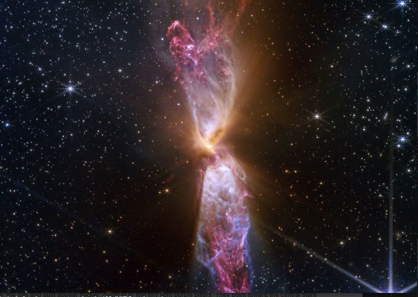 O que o Telescópio Espacial James Webb captura é o que você vê em nossa imagem de capa. São duas estrelas jovens em plena formação e por conta dessa condição são responsáveis pelos chocantes jatos de gás e poeira em tons de laranja, azul e roxo.