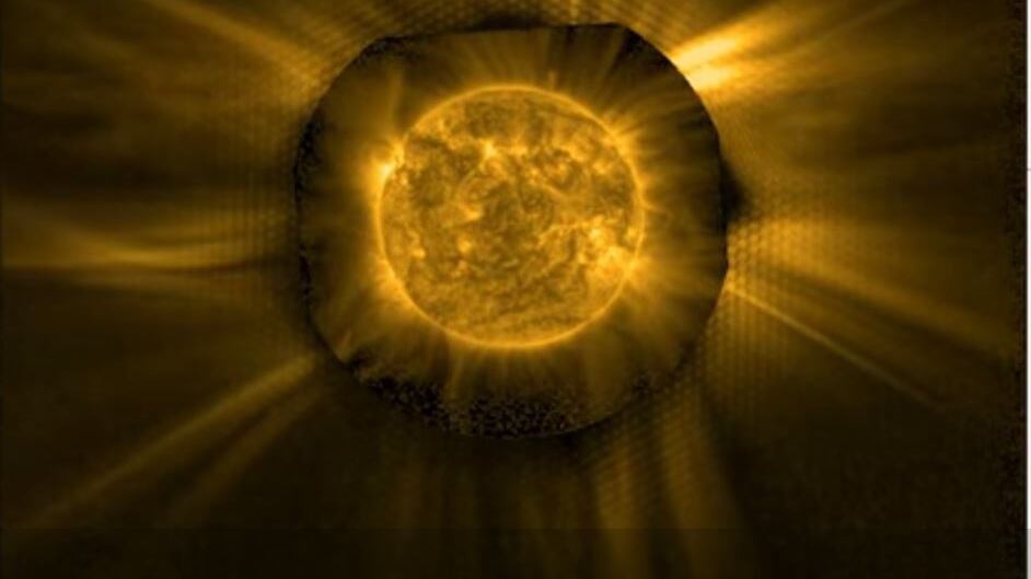 O que estamos vendo nesta imagem da ESA? A atmosfera quente do Sol, a milhões de graus, chamada de corona, vista na luz ultravioleta
