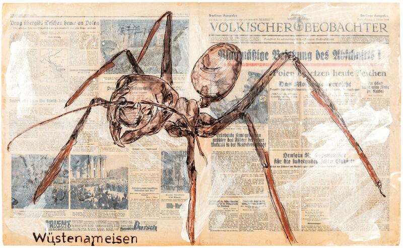 Sua vivência no país europeu influencia na exposição: a série “Tempos para Desenhar” apresenta ilustrações de insetos e pragas em jornais originais do período nazista e também entra para a mostra.