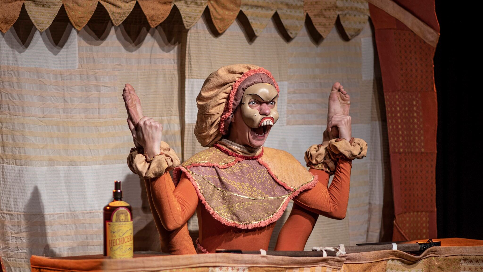 A peça em questão mistura o uso de máscaras balinesas com teatro popular e circo tradicional, num jogo direto com a plateia. Essas máscaras são um elemento trazido da tradição Topeng, de Bali (Indonésia). A ideia é fazer uma alusão aos palhaços.