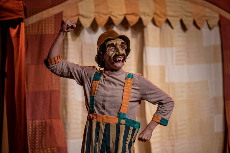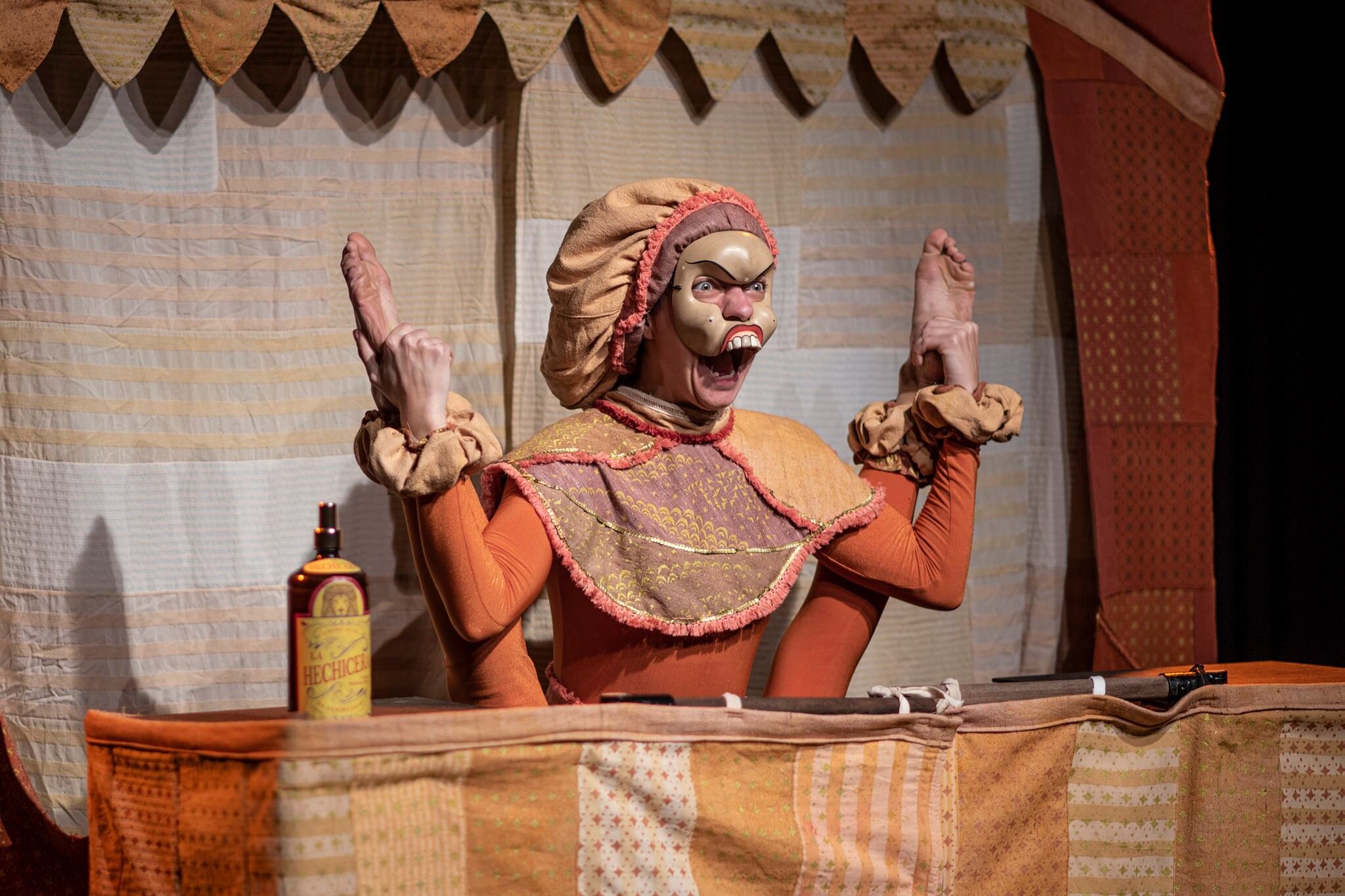 A peça em questão mistura o uso de máscaras balinesas com teatro popular e circo tradicional, num jogo direto com a plateia. Essas máscaras são um elemento trazido da tradição Topeng, de Bali (Indonésia). A ideia é fazer uma alusão aos palhaços.