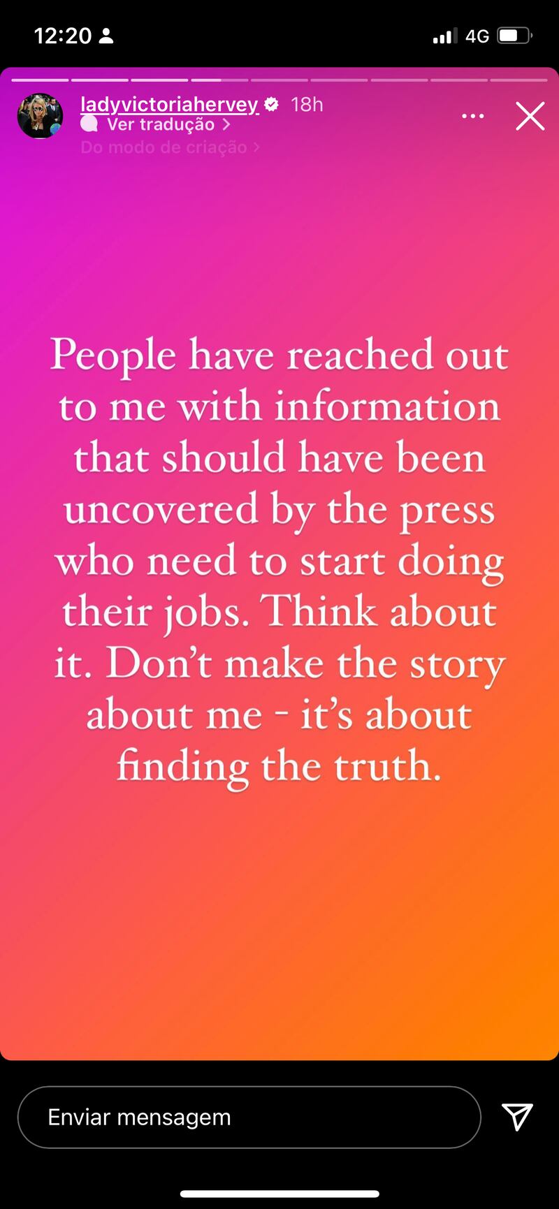 E continua: “Pessoas me procuraram com informações que deveriam ter sido divulgadas pela imprensa, que precisava começar a fazer seu trabalho. Pensem sobre isso. Não façam a história sobre mim - é sobre encontrar a verdade”. Ela escreveu essa declaração e logo depois postou uma imagem da matéria veiculada no Daily Mirror sobre o fato.