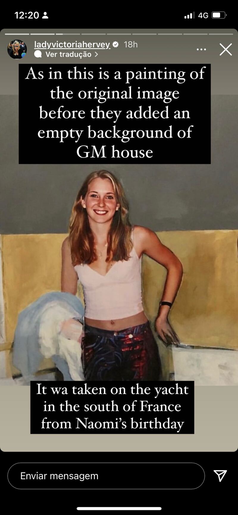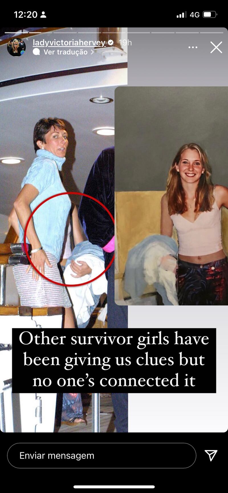 Usando sua conta no Instagram, a ex-namorada do príncipe Andrew, a socialite Victoria Hervey, afirmou que uma das imagens mais famosas do príncipe Andrew posando ao lado de Virginia Giuffre pode ser falsa. Ela postou em seu Instagram, mais especificamente nos Stories, uma foto para apoiar seu argumento. Veja abaixo.