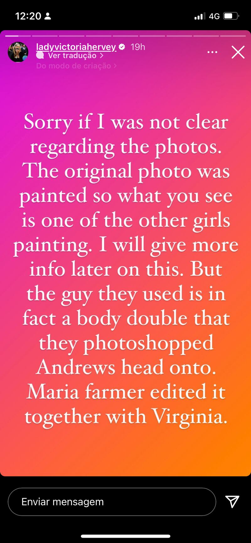 Ela escreveu: “Desculpe se não fui clara em relação às fotos. A foto original foi manipulada. Eu vou dar mais informações mais tarde sobre isso. Mas, o cara que eles usaram é na verdade um dublê de corpo no qual eles photoshoparam a cabeça de Andrew. Maria Farmar editou junto com Virginia”.