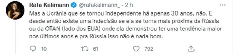 Com a tensão entre Rússia e Ucrânia em pauta, a influenciadora digital resolveu usar o Twitter para comentar sobre o assunto: “Vou tentar resumir pra vocês sobre a Rússia e a Ucrânia: O que eu entendo sobre, se tiver algum ponto de equívoco, me falem. E por favor pesquisem para aprofundar, é só um resumo pessoal”.