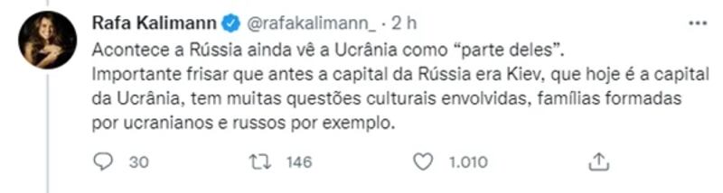 Por fim, ela escreveu: “Acontece que a Rússia ainda vê a Ucrânia como “parte deles”. É importante frisar que antes a capital da Rússia era Kiev, que hoje é capital da Ucrânia, tem muitas questões culturais envolvidas, famílias formadas por ucranianos e russos, por exemplo”.
