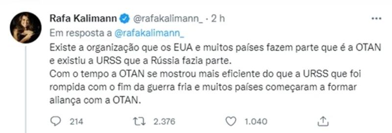 Em seguida, ela tentou ampliar o debate nas redes sociais. “Existe a organização que os EUA e muitos países fazem parte que é a Otan e existiu a URSS que a Rússia fazia parte. Com o tempo, a Otan se mostrou mais eficiente do que a URSS que foi rompida com o fim da guerra fria e muitos países começaram a formar aliança com a Otan”.