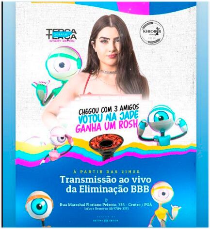 Emoções a parte, vale tudo para ajudar a eliminar o BBB mais rejeitado e neste paredão a bola da vez e a Jade. Por isso, um bar da cidade de Poá, em São Paulo, promete dar um prêmio nesta terça-feira a quem chegar no local com mais três amigos e votar para que a influenciadora digital deixe o programa.