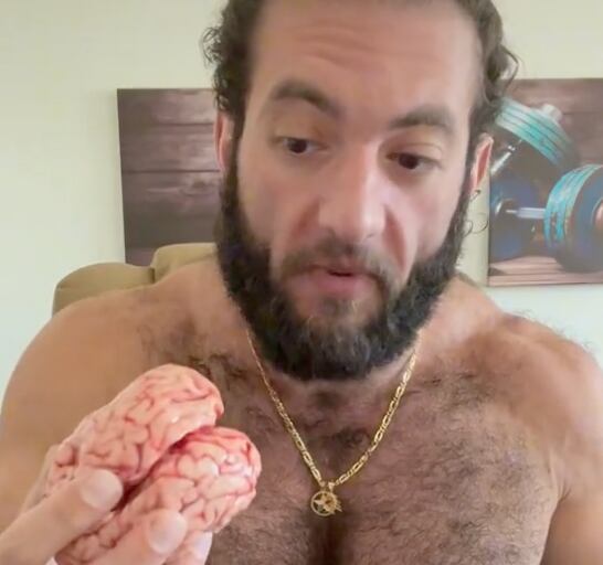 “O que fazer quando não se tem muito tempo para cozinhar? Como dois ovos crus e um cérebro cru de vaca”, diz o fisiculturista Weam Breiche em um vídeo postado no TikTok, pouco antes de morder um enorme cérebro cru.