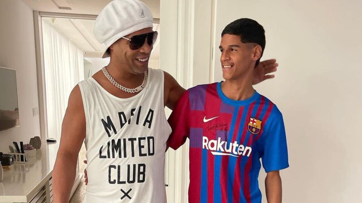 Iran Ferreira, responsável pelo perfil @luvadepedreiro, é um grande fã de Ronaldinho e no momento utilizou uma camiseta do clube Barcelona.