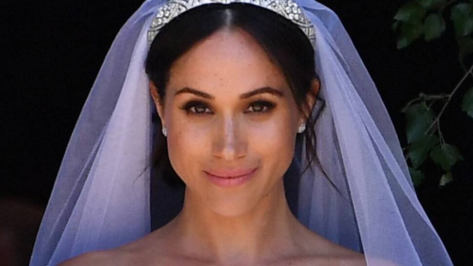 Enquanto o decote de Meghan Markle era um pouco mais amplo que o de Angela, as duas mantiveram suas jóias simples e acessórios com tiaras usadas para trás em suas cabeças, véus esvoaçantes e seus cabelos presos em coques baixos.