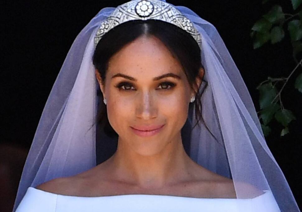 Enquanto o decote de Meghan Markle era um pouco mais amplo que o de Angela, as duas mantiveram suas jóias simples e acessórios com tiaras usadas para trás em suas cabeças, véus esvoaçantes e seus cabelos presos em coques baixos.