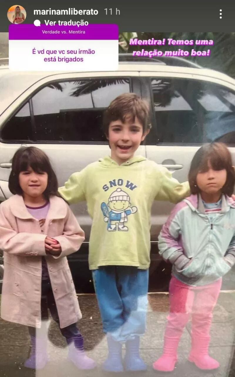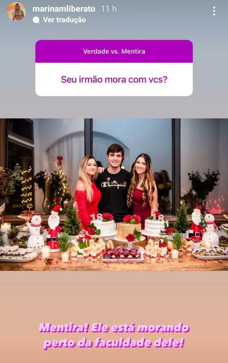 Em um jogo de “verdade e mentira”, na noite de quarta-feira (11), um seguidor perguntou a Marina se ela e o irmão estão brigados. Ela respondeu: “Mentira! Temos uma relação muito boa!”, disse. Em seguida, ela respondeu a outra pergunta esclarecendo que eles não moram juntos: “Ele está morando perto da faculdade dele!”, contou.