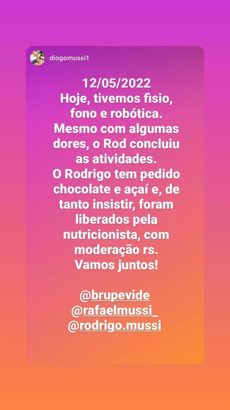 “Hoje [12/05] tivemos fisio, fono e robótica. Mesmo com algumas dores, o Rod concluiu as atividades. O Rodrigo tem pedido chocolate e açaí e, de tanto insistir, foram liberados pela nutricionista, com moderação...rs. Vamos juntos!”, relatou Diogo.