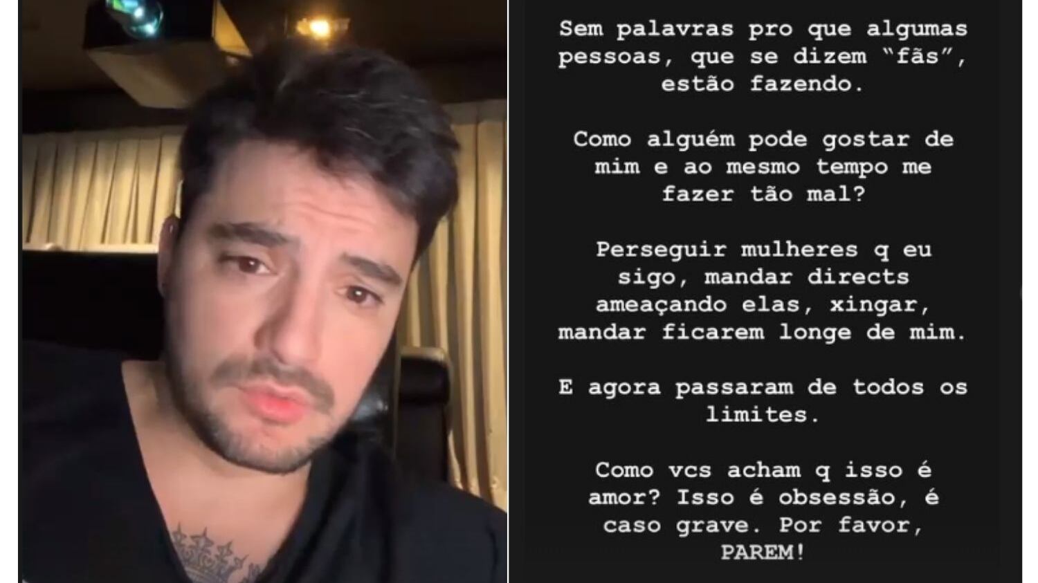 “Sem palavras pro que algumas pessoas, que se dizem ‘fãs’, estão fazendo. Como alguém pode gostar de mim e ao mesmo tempo me fazer tão mal? Perseguir mulheres que eu sigo, mandar directs ameaçando elas, xingar, mandar ficarem longe de mim. E agora passaram de todos os limites. Como vocês acham q isso é amor? Isso é obsessão, é caso grave. Por favor, PAREM!”, escreveu ele.