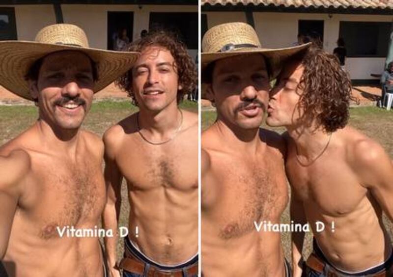 Outra foto, mostra Guito, que faz o peão Tibério, ao lado de Jesuíta Barbosa, que já apareceu sem roupa em outro post. Na imagem, eles estão tranquilos e o protagonista de “Pantanal” tasca um beijo na bochecha do colega de elenco, durante um banho de sol. Jesuíta aparece ao lado da atriz Julia Dalavia, que faz Guta.