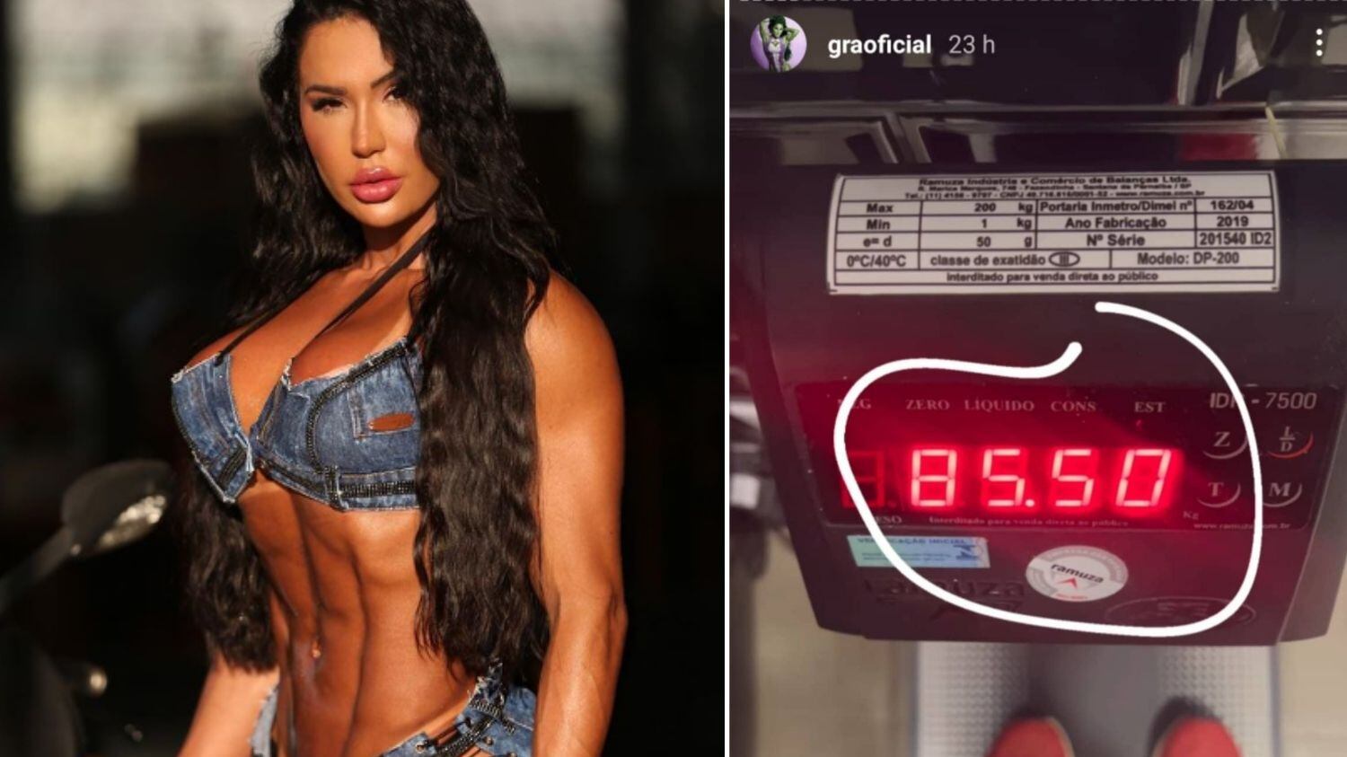 A musa fitness Gracyanne Barbosa, de 38 anos, surpreendeu seus seguidores ao mostrar seu peso. Na terça-feira (31), ela gravou um story e revelou que está com 85,5 kg. “Chocada”, disse ela.