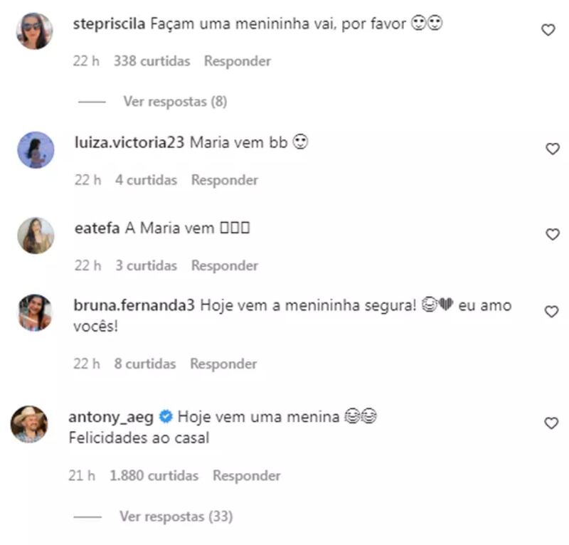 “Hoje vem uma menina”, comentou um seguidor. “Façam uma menininha vai, por favor”, sugeriu outra fã. “Hoje vem a menininha. Amo vocês”, disse outro comentário.