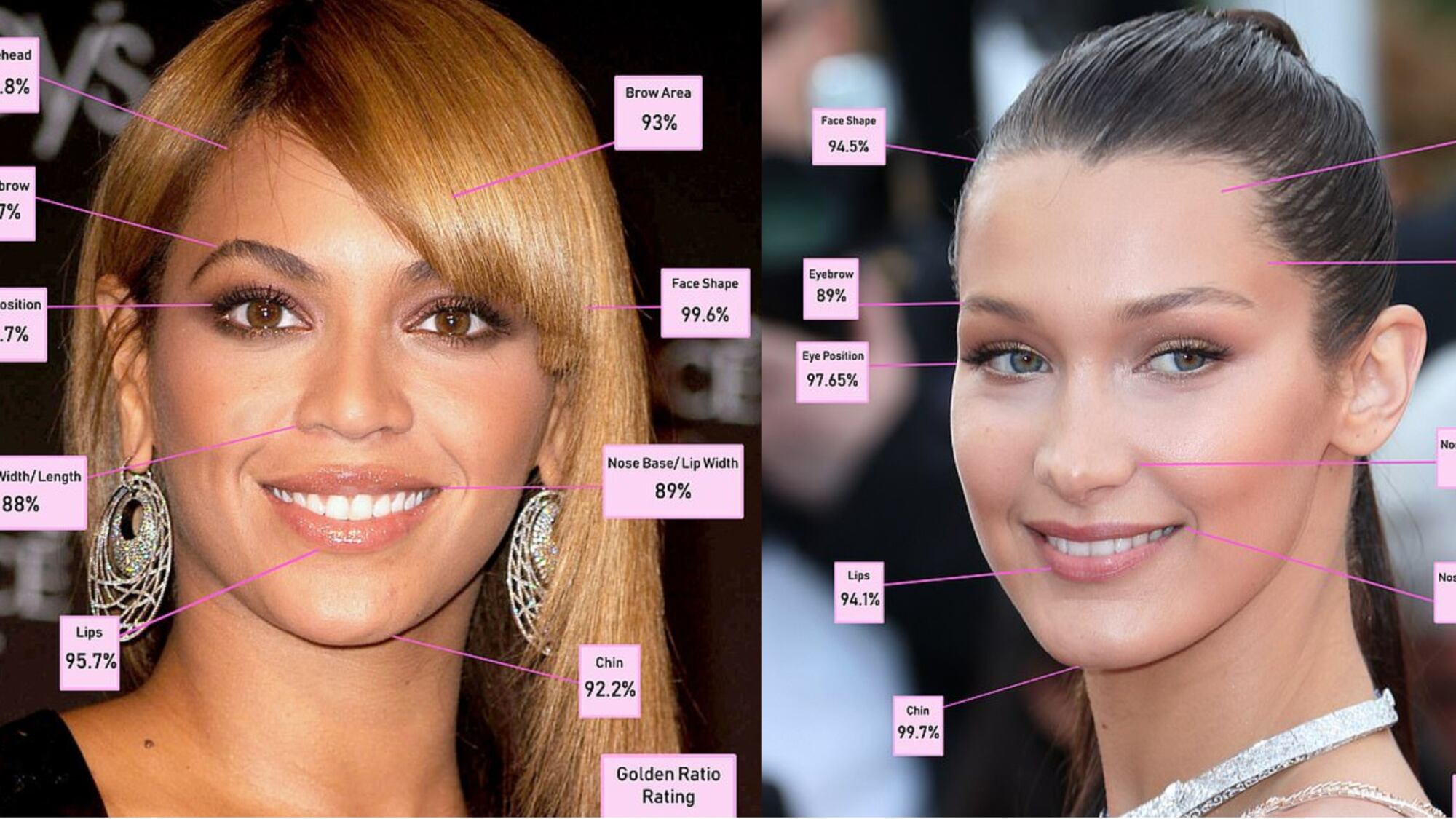 No final de 2019, em colaboração com a revista Bazaar e com o portal Daily Mail, Bella Hadid, a supermodelo norte-americana de 25 anos, foi eleita como o rosto mais bonito do mundo ainda vivo, após um mapeamento realizado pelo cirurgião dr. Julian De Silva. A modelo recebeu a porcentagem de 94,35% de beleza.