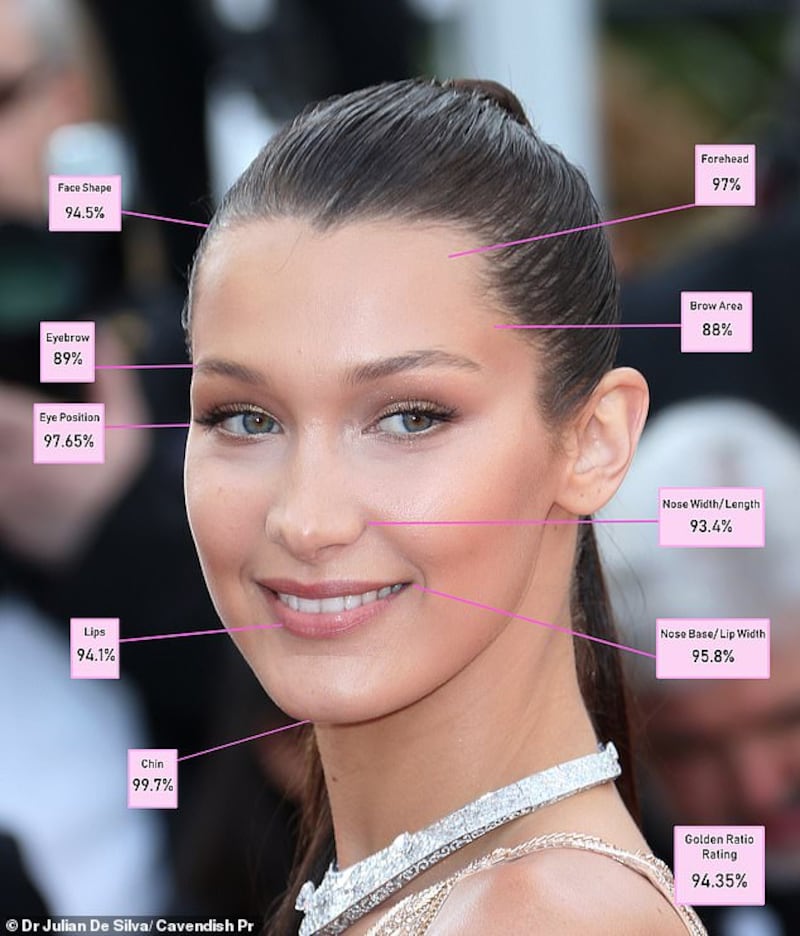 No final de 2019, em colaboração com a revista Bazaar e com o portal Daily Mail, Bella Hadid, a supermodelo norte-americana de 25 anos, foi eleita como o rosto mais bonito do mundo ainda vivo, após um mapeamento realizado pelo cirurgião dr. Julian De Silva. A modelo recebeu a porcentagem de 94,35% de beleza.