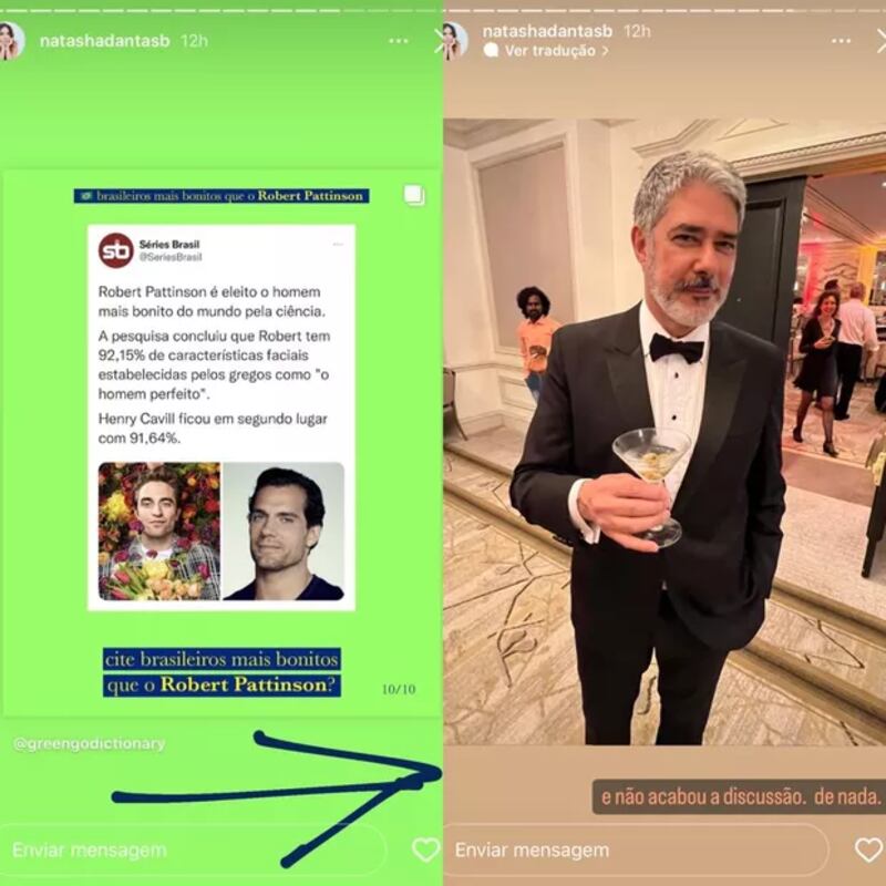 Embora a estrela hollywoodiana tenha ganhado o pódio número 1, Natasha Dantas afirmou nesta quinta-feira (23) que seu marido, o apresentador do ‘Jornal Nacional’ William Bonner, é mais bonito do que Pattinson. A fisioterapeuta publicou uma foto do jornalista e o comparou com o ator.