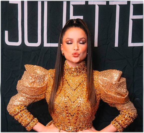 Com um look dourado da cabeça aos pés e esbanjando elegância, a ex-BBB Juliete Freire se apresentou nesta sexta-feira na festa de São João de Campina Grande, na Paraíba, cidade onde nasceu e onde até hoje vive grande parte de sua família.