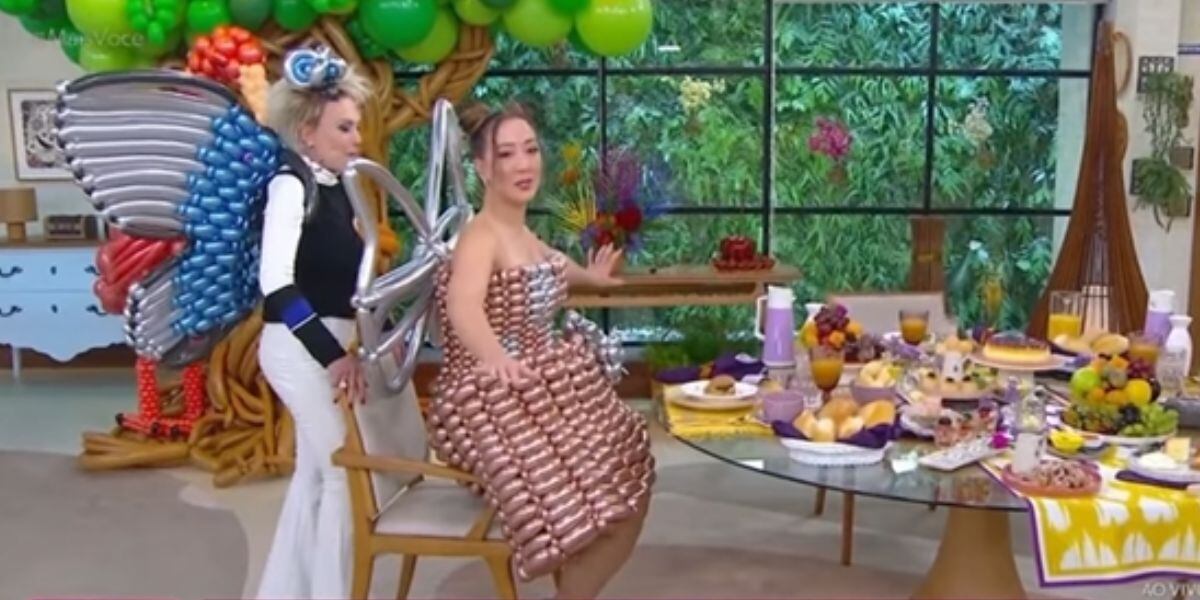 Ju usava um vestido todo feito de pequenos balões acompanhando o cenário do matinal, decorado com o material. Na hora de se sentar à mesa para dar início ao quadro “Feed da Ana”, a loira fez questão de ajudar a companheira a “entrar” na cadeira, o que não foi uma tarefa nada fácil por conta do volume da roupa. Foi então que Ana soltou a observação.