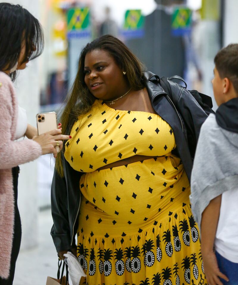 Ao desembarcar no aeroporto Santos Dumont, no Rio de Janeiro, a famosa apareceu com um vestido amarelo estampado e para não sentir o friozinho dentro do avião, ela optou por usar uma jaqueta de couro clássica.