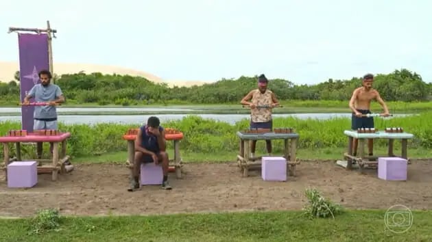 Ontem também rolou a Prova da Imunidade. Os competidores precisavam se equilibrar em uma plataforma segurando apenas uma corda com alguns nós. A cada sinal de Fernando Fernandes, os participantes desciam um nó, ficando cada vez mais inclinados.
