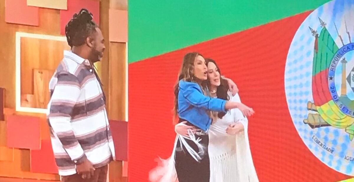 Com um vestido longo e um salto plataforma, Claudia deu uns passos na frente do telão, que estava mostrando a bandeira do estado. Na sequência, a apresentadora do programa da Globo, que é gaúcha, mostrou sua empolgação e aplaudiu a artista, que é famosa por seus musicais e espetáculos de dança.
