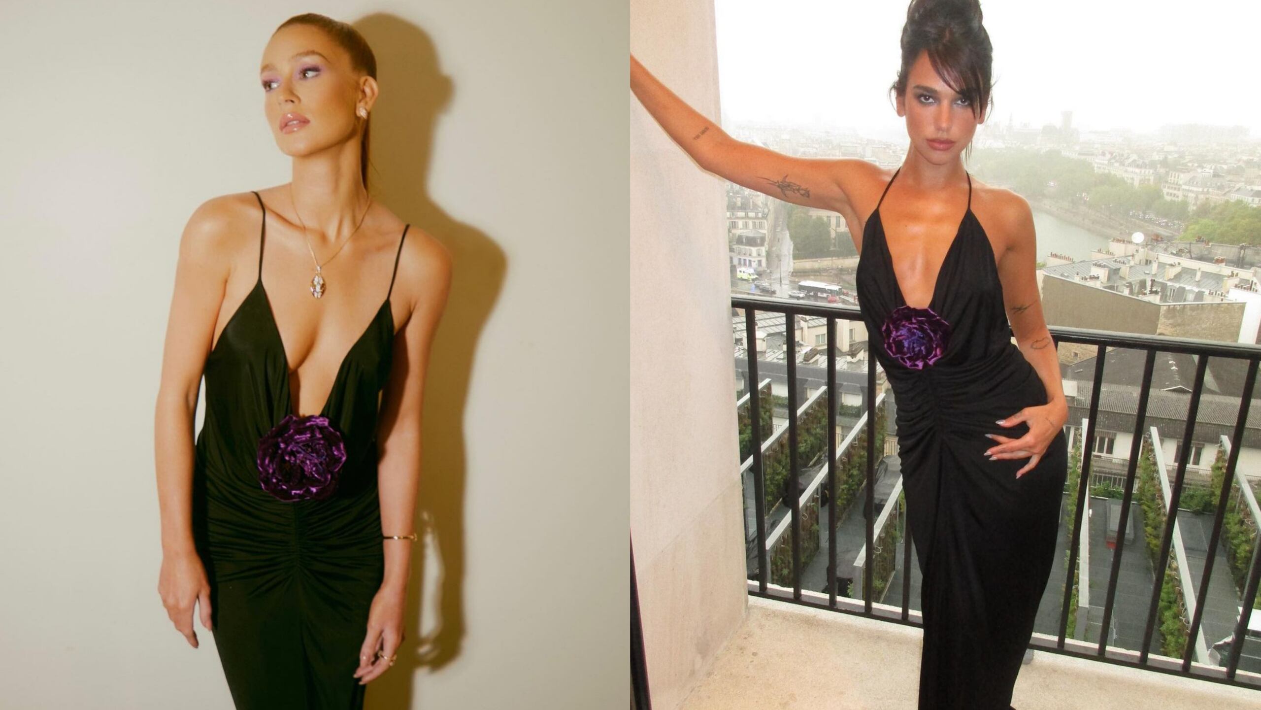 O mesmo look da marca de grife, já consagrada, foi utilizado por Dua Lipa em Paris, na França. O vestido possui uma coloração básica de preto, além de um decote marcante. A peça também possui uma flor roxa no fim do decote, caracterizando-se como o detalhe chave da roupa.