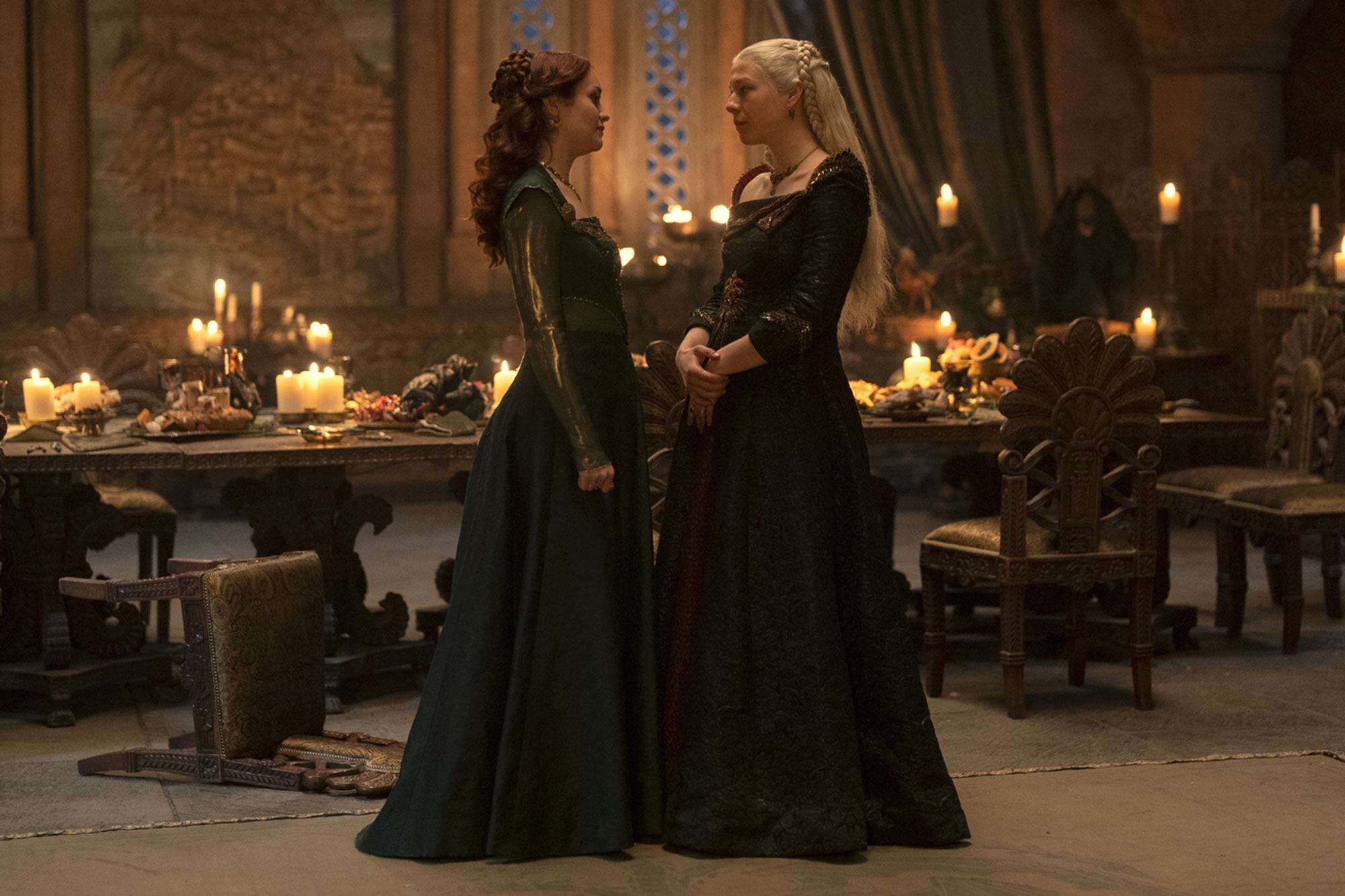 O desenho é projetado para remeter as suas personagens de ‘A Casa do Dragão’; Cooke está de verde, como Alicent Hightower, e D’Arcy está de preto, como Rhaenyra Targaryen.