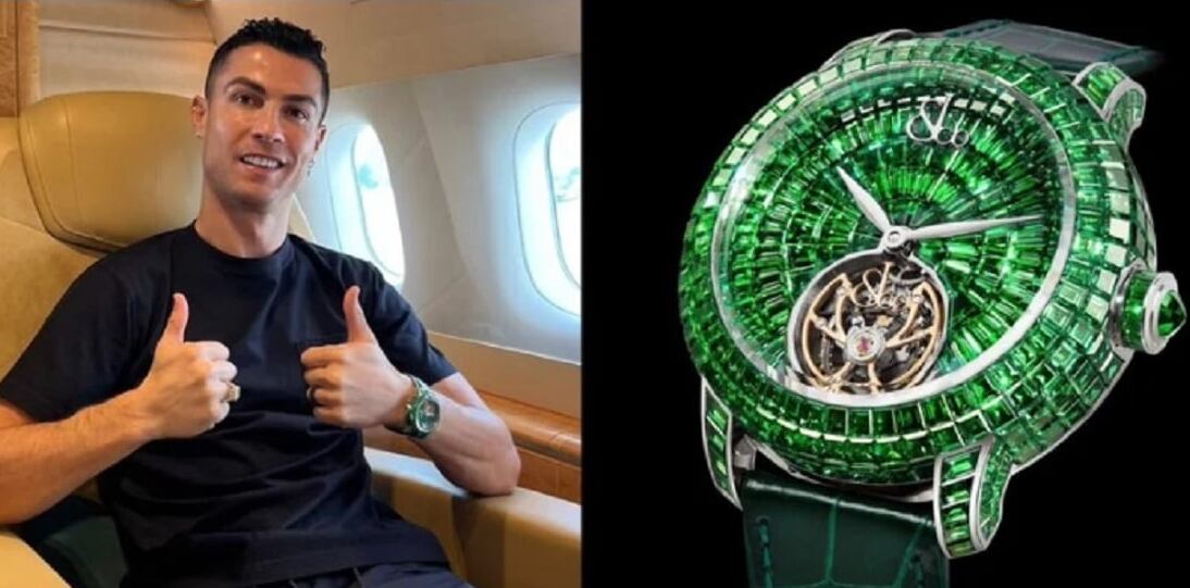 A peça presa ao pulso do jogador português é um modelo do Caviar Flyin Tourbillon, da relojoaria luxuosa Jacob & Co, e conta com caixa Caviar de 47 mm × 15,85 mm em ouro branco 18K e 388 pedras tsavoritas verdes.