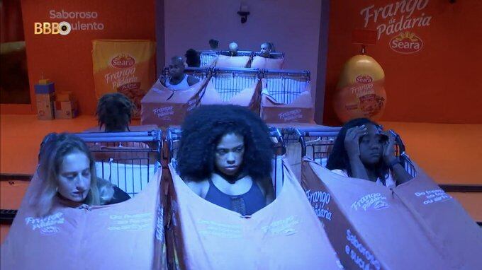 Na dinâmica, os brothers devem ter o máximo de atenção e resistir ao forno, ao frio e à fritadeira elétrica girando dentro de carrinhos de supermercado.