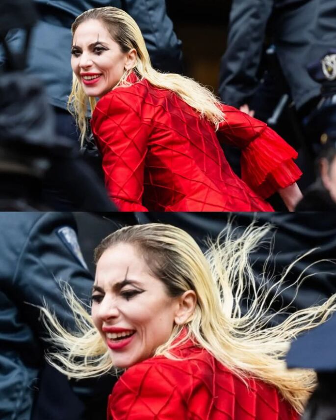 Se você olhar de perto, poderá ver que a personagem de Gaga está usando uma maquiagem dramática nos olhos (que lembra a do Coringa), e ela também tem um pequeno rasgo na meia-calça.