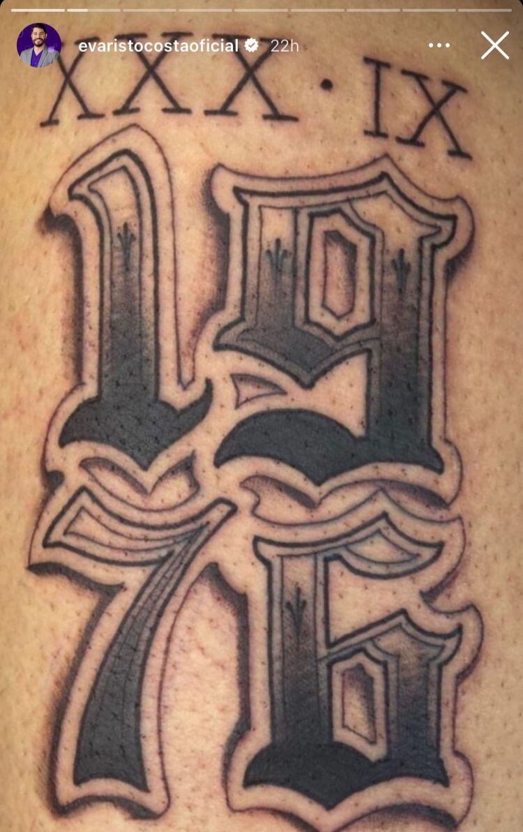 Horas depois Evaristo postou um story com o verdadeiro significado da tatuagem. O desenho é composto pela sequência XXX-IX e o ano 1976.