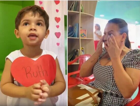 Na gravação feita na escolinha de Léo, a criança aparece com um coração escrito ‘Ruth’ e cantando, depois avó e neto brincam juntos.
