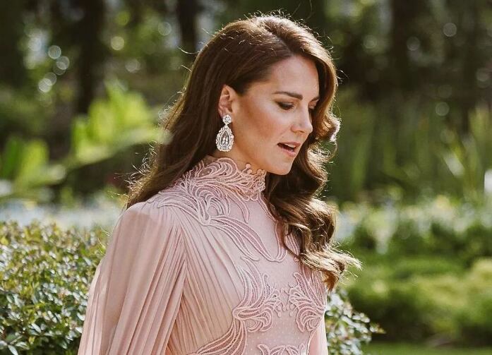 Para a cerimônia do príncipe herdeiro Al Hussein bin Abdullah e da princesa Rajwa Al Hussein da Jordânia, a princesa Kate usou um vestido Elie Saab cor de blush da coleção prêt-à-porter Outono/Inverno 2017 da marca. Tivemos um vislumbre do de como ficou o look em uma postagem na conta conjunta da princesa Kate e do príncipe William, 40, no Instagram.