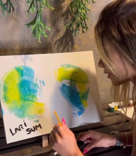 “Meus amores! Um querido me fez um pedido especial e é claro que eu tive que atender! Olha aqui minhas matérias primas para realizar esta obra de arte! Será que vocês adivinham o que vou fazer com esse tanto de tinta e esse quadro?”, declara Lari antes de iniciar a pintura.