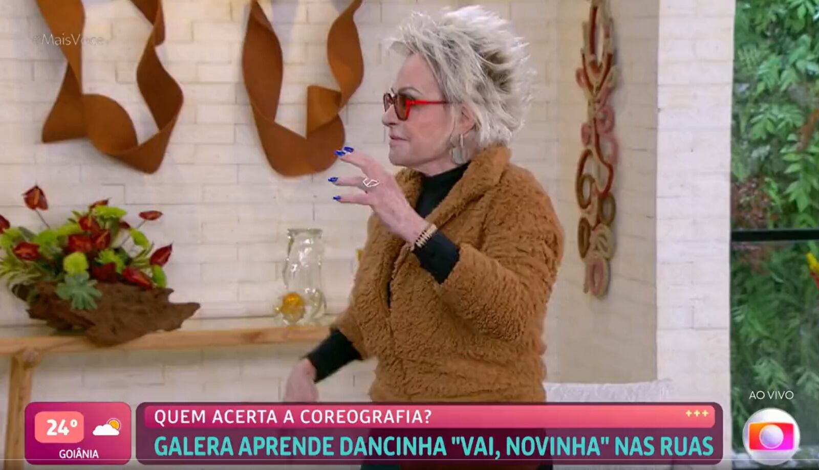 Nos estúdios, Ana Maria divertiu os espectadores com mais uma dancinha icônica de ‘Vai, novinha’, que viralizou nas redes sociais. Confira o momento abaixo: