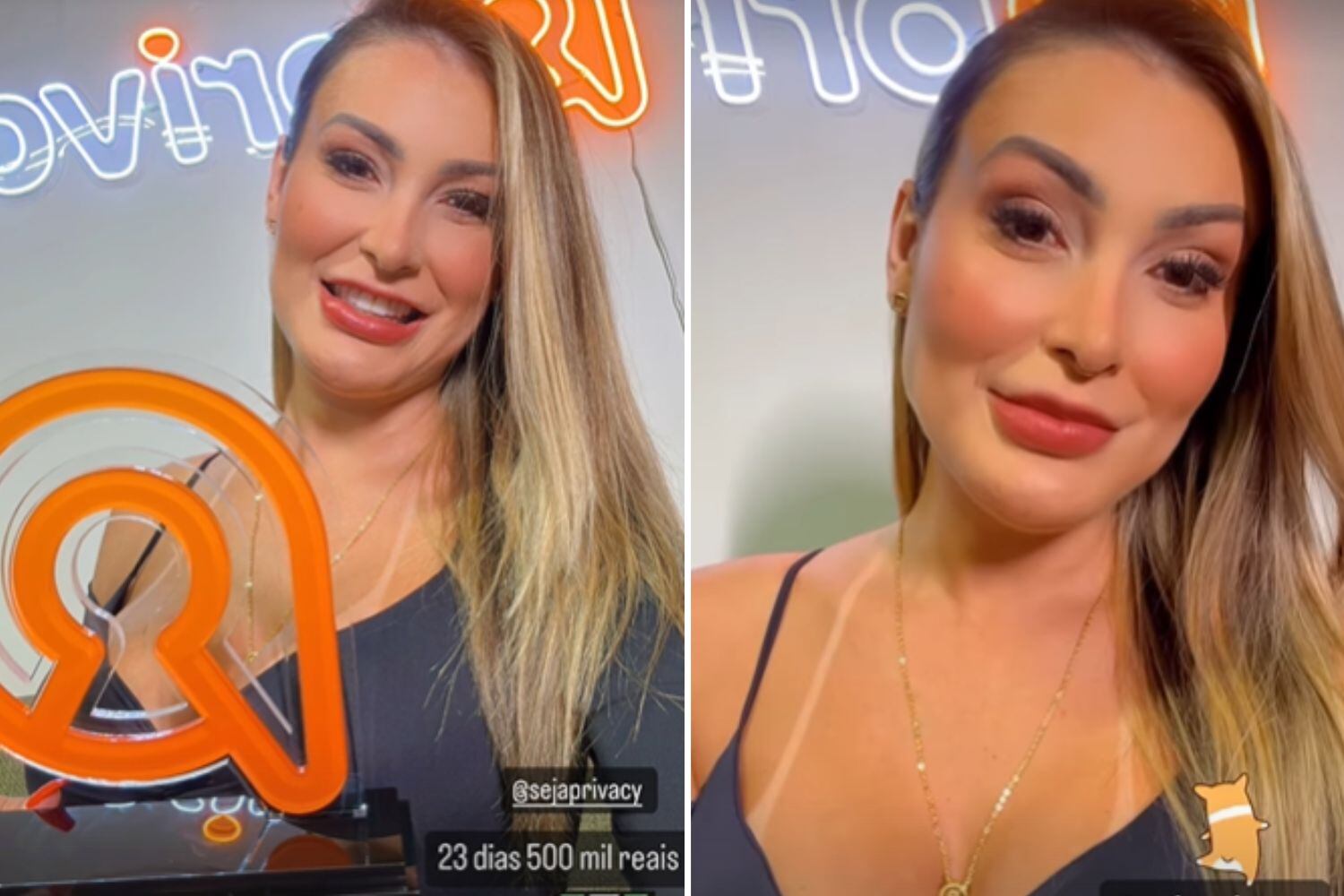 A modelo Andressa Urach continua a colher frutos de sua volta ao entretenimento adulto. Em suas redes sociais, ela mostrou aos seus seguidores um “troféu” que ganhou do site Privacy, pois em 23 dias faturou R$ 500 mil. Ela aproveitou para dizer que pretende ajudar a mãe com esse dinheiro e também agradeceu ao filho Arthur, de 18 anos, que grava parte de seu conteúdo postado na plataforma adulta.