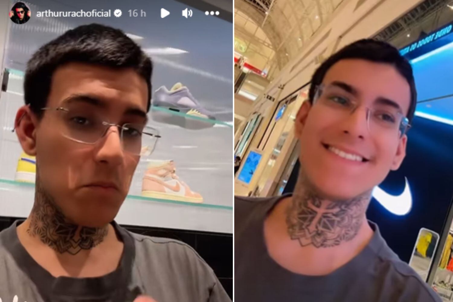 “Estamos aqui na loja da Nike e tem muitas opções”, disse o rapaz, que continuou: “bem, gente, nosso objetivo hoje era comprar um colchão, mas fomos na Nike e gastamos uma nota. Uma notinha, não foi muito alta assim. Só uns dois salários mínimos....quase três”, revelou Arthur.