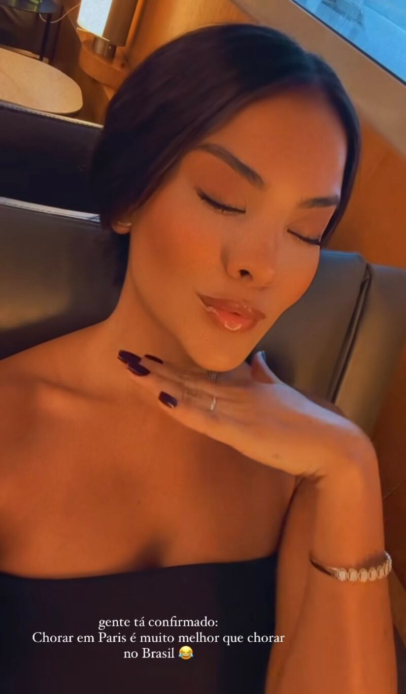 Em um vídeo publicado em sua conta do Instagram, Bella Campos revelou que estava fazendo uma conexão em Paris durante sua viagem ao Egito para participar do lançamento de uma marca. Com um toque de humor, ela citou um meme que circula nas redes sociais, afirmando: "Gente, tá confirmado: chorar em Paris é muito melhor que chorar no Brasil."