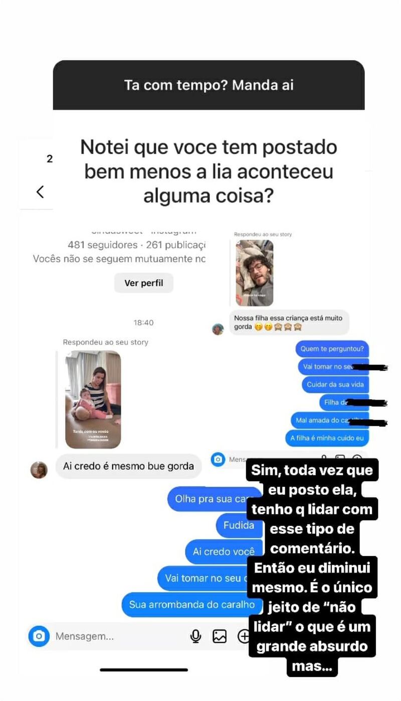 "Toda vez que eu posto ela tenho que lidar com esse tipo de comentário. Então diminuí mesmo. É o único jeito de 'não lidar', o que é um grande absurdo, mas…", desabafou Eliezer ao mostrar exemplos dos comentários desrespeitosos que havia recebido sobre sua filha, que está sendo chamada de "gorda".