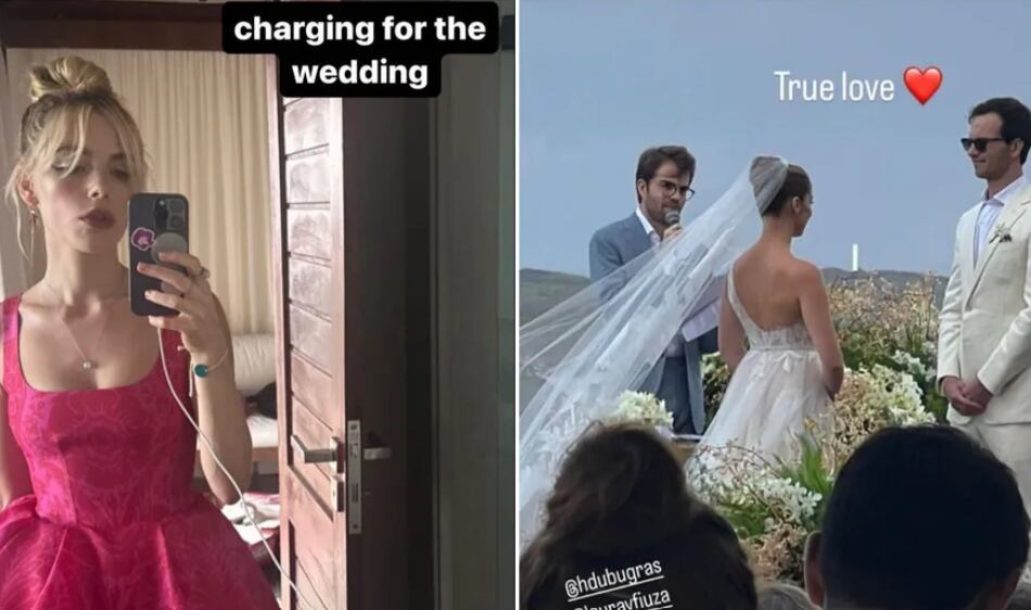 Antes mesmo da cerimônia, a atriz compartilhou uma foto do seu look rosa. Em seguida, postou uma foto do casamento com a legenda “congratulations”.