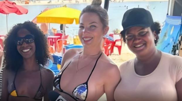 “Você achou que eu não ia fazer?”, questionou a repórter, que tirou a sua regata para mostrar o biquíni.
